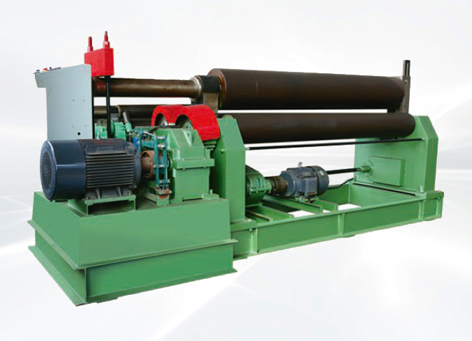 該機結構型式為三輥非對稱式,下輥為主傳動,並做垂直升降運動,以便(biàn)夾緊板(bǎn)材。通過下輥(gǔn)齒(chǐ)輪與(yǔ)上輥齒(chǐ)輪齧(niè)合,同時作為(wéi)主傳動,側作傾升降運動。具有預彎、卷圓多重功能(néng),結構緊(jǐn)湊操作維修方便